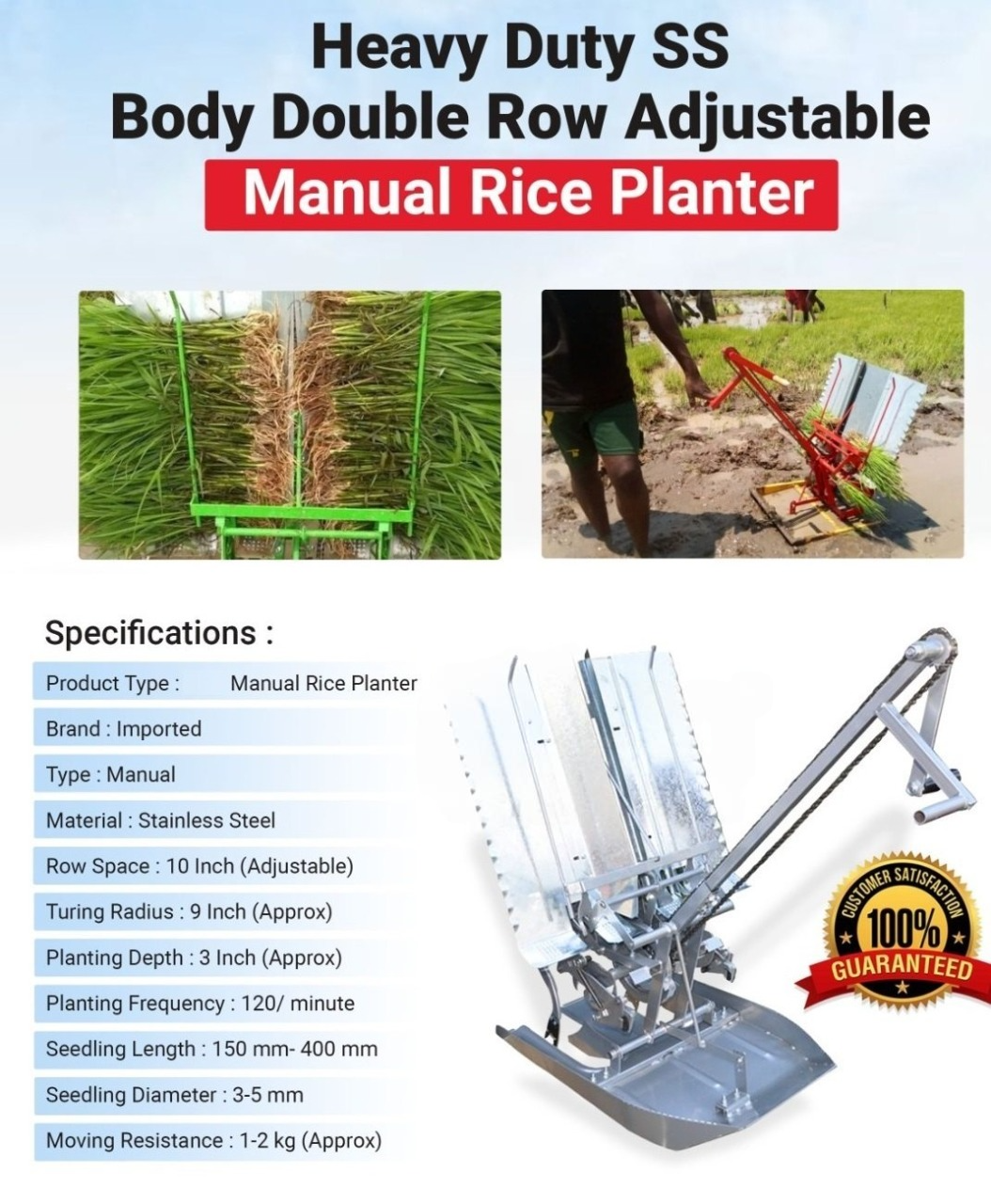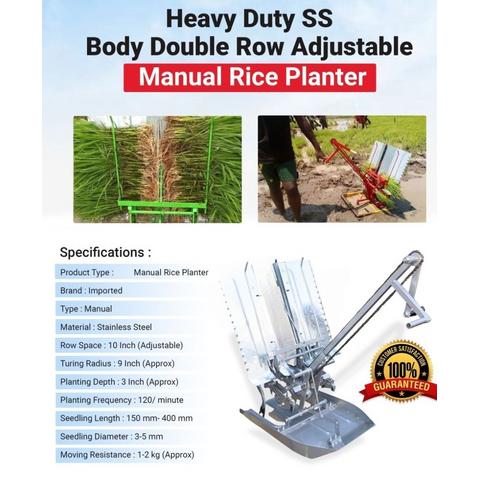Equipped with 2 rows, this transplanter allows you to plant rice with utmost efficiency. Say goodbye to the tedious task of planting one seedling at a time. With the SS Body Manual Rice Transplanter 2 Rows, you can cover a larger area in less time, significantly increasing your productivity.