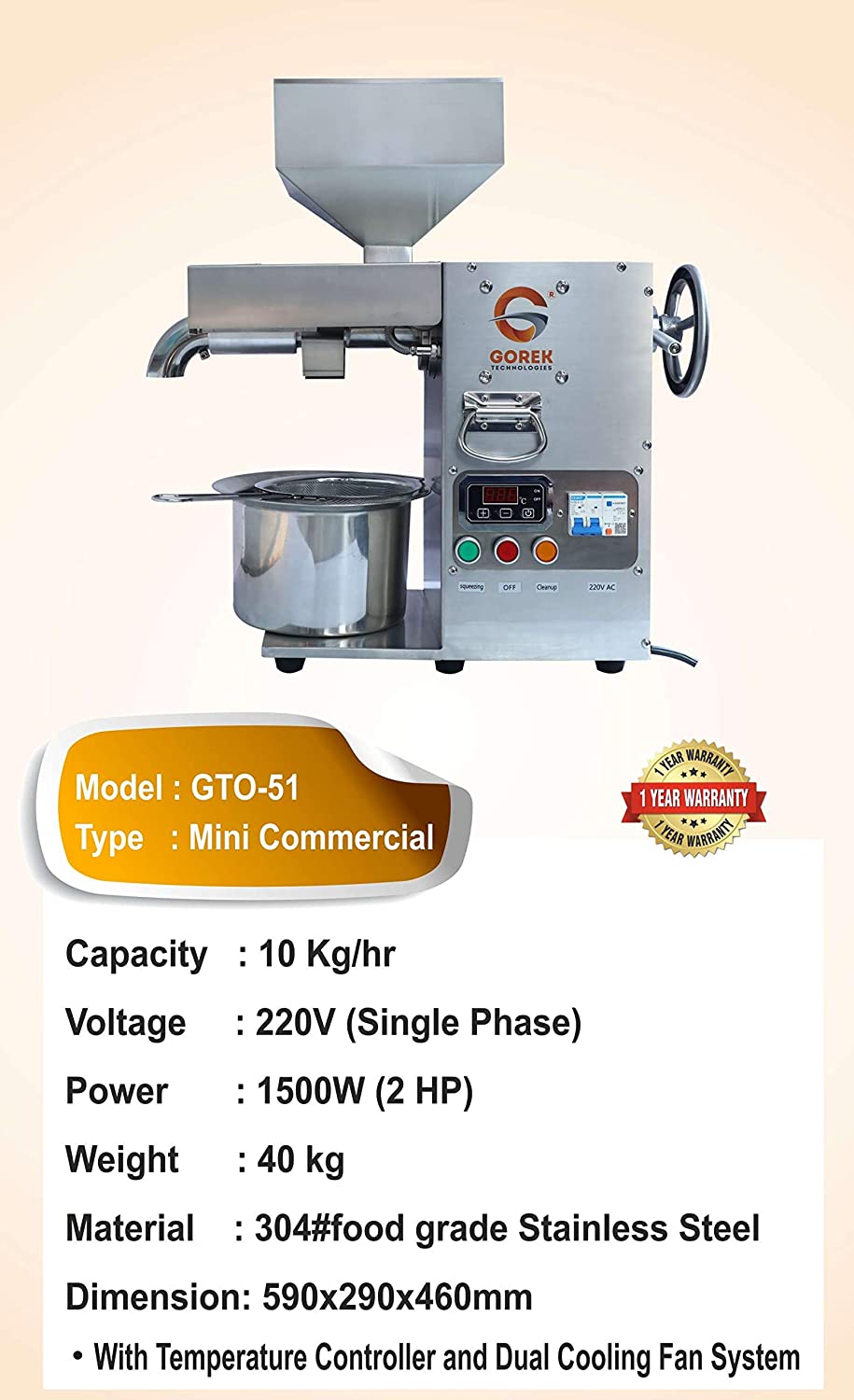 - Commercial-Grade Excellence: Elevate your oil production to commercial standards with the GTO-51. This machine consistently delivers high-quality output, meeting the expectations of discerning customers and positioning your products as top-tier in the market.