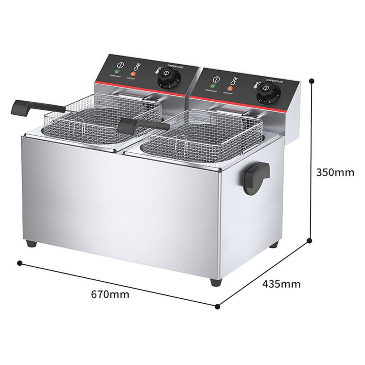 In conclusion, our Stainless Steel Double Deep Fryer (6 + 6 Liters) is a must-have for any food establishment looking to enhance their frying capabilities. With its spacious capacity, efficient heating system, and user-friendly features, this fryer will elevate your cooking experience and deliver mouthwatering results. Invest in this top-notch fryer today and take your culinary creations to the next level.
