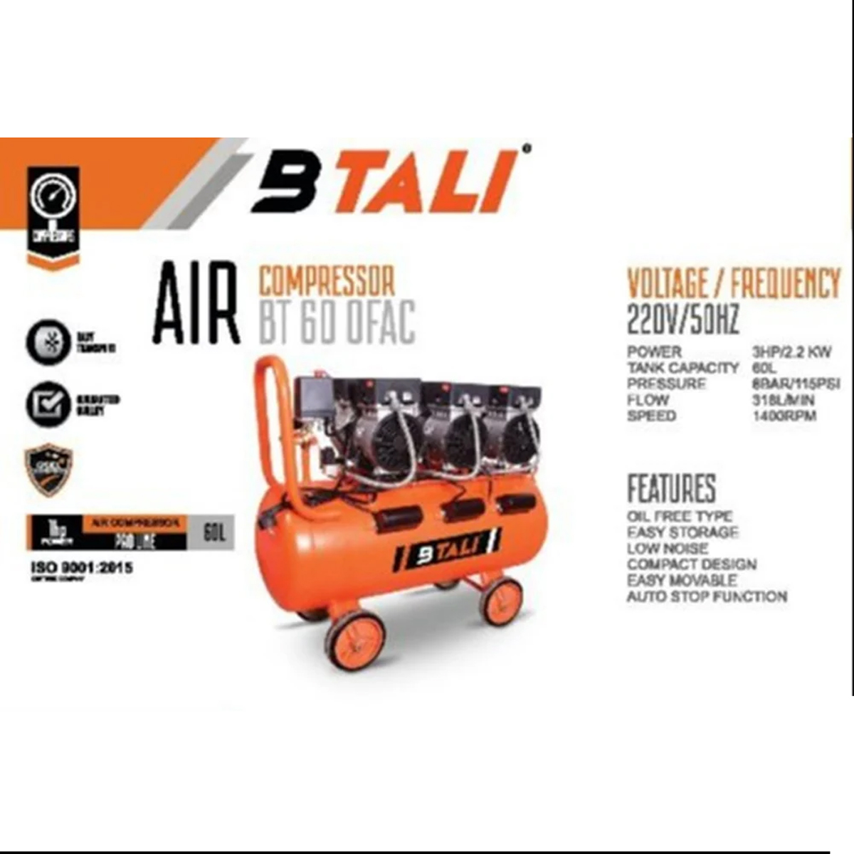 The Btali 60Litre Oil Free Air Compressor 3HP is not only powerful but also built to last. Constructed with high-quality materials and precision engineering, this compressor is designed to withstand the rigors of daily use in demanding industrial environments. Its robust build ensures durability and longevity, providing you with a reliable and long-lasting solution.